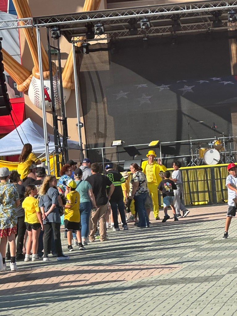 We left in the early afternoon hours after finding out our seats were in Section 402 down the left field line and the foul pole was in front of us. But we didn’t mind that, we were glad to just have a great view from the lower upper deck. After having our tickets scanned, we got to see the world famous Banana Band playing their tunes with their tubas and saxophones and trombones. We saw that the band was set up right in front of the home plate gate, so that was nice. We saw that there were plenty of food trucks and merchandise stands set up on the pavement. After buying a couple of smoothies, I jumped into the long merchandise line and it only got longer behind me. Thankfully it was like two hours before the game started and Dad joined in the line after getting our smoothies. Once we finally got to the front of the line, we went to purchase some merch. I bought a yellow Savannah Bananas logo shirt(I was already wearing a blue one that I got for Christmas) and also decided to get my hands on Jesse Cole’s novel “Fans First”. I can’t wait to read out of that book. Dad ended up getting a large replica Bananas baseball(the ball is pretty large and hard and it’s probably not for throwing around). As we looked to enter the stadium gates, we saw a long line of people who were standing single-file to meet the man behind the Bananaland experience himself in Mr. Jesse Cole. I decided not to go in line to meet him, but I did take a pic of him and the line of fans from afar. So, we walked into the stadium and we walked up the ramps to the upper deck(where we have not sat in as much over the past few years for Angels games) and we made our way onto the upper deck at the Big A. Walking through the slim and slender platform(an unfortunate problem with the upper deck’s structure at my hometown ballpark), we found our way to a section of the stadium that we haven’t sat in for a long time(or ever in my case) in the left field upper deck down the foul pole. Thankfully, we were in the shade and if we had been in the right field upper deck(or right field pavilion seats), we would be straight in the sun and that was something we wouldn’t be able to bear, especially given the warm weather on this day.