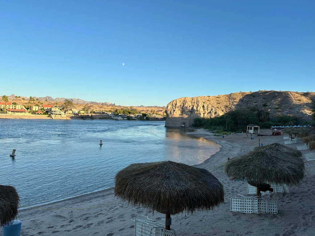 Speaking of which, the pool was freezing cold. Obviously, it was shallow(as all hotel pools are these days) with a maximum depth of only five feet. But the water was icy cold, probably due to the fact that the casino is located in a desert town where the high temperatures can reach to be as hot as 110+ degrees. So, the water probably feels more refreshing when it’s scorching hot and humid, but since the weather conditions for when we went into the pool only had the air temperature in the lower 80s with some breezy riverside wind, we felt very cold in the shallow water. Putting our lower body parts in the pool and then trying to adjust to the cold water hitting our torsos was not easy. Dad could barely last and I only managed to put the back of my head in the water(not all the way in). But at least we had alcoholic drinks from the Cancun Lagoon joint to keep us focused on something other than the cold pool. There was also a jacuzzi, but it was occupied by other guests during the moments we were there and due to our plans of watching baseball and college football games we didn’t have time to go into it ourselves. The hot tub was definitely the opposite temperature of the pool, which fewer people were in. Finally, the resort has a riverside beach area near the dock where the ferry boats come to transport people to different docks of casinos located upstream from Harrah’s. But it was mostly vacant other than for those who were water-skiing with motorized jet ski mobiles that make up for the water recreation in the Laughlin-Bullhead City area. That activity is the only reason why somebody should be on their own in the middle of the Colorado River and they obviously need to wear a life vest while doing that activity. Other than some kids dipping their toes into the river water that came to shore, the river was mostly empty, as it should be. Regardless, there were nice views of the mostly full moon in the evening sky and that patio area provided us with some perfect scenery.