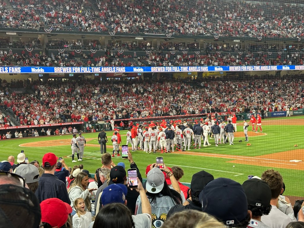 Soler stared out at López, who was coming back onto the mound. Some words were said between them and then eventually Soler ran to fight against López, who stood his ground and delivered some defensive punches as Soler clawed towards him. Both benches cleared out as Soler got hit while wearing his helmet by the baseball in López’s hand. López was pushed away as Soler got tackled by Braves manager Walt Weiss and a couple of other Atlanta players held him back. López was escorted away by Mike Trout and Braves first base coach Antoan Richardson. The brawl was eventually broken up, Soler went off to the Angels’ clubhouse and the umpires discussed who should be ejected. Crew chief Vic Carapazza announced that Soler and López were both ejected from the game and that both teams were issued warnings for the rest of the game. There was a long roughly 15-minute delay as the new pitcher for Atlanta in Tyler Kinley had to warm up for an extended period of time and the pinch hitter for Soler was Jeimer Candelario. Besides the brawl on the field, there was at least one fan sitting in the third base luxury box suite who was attempting to come onto the field and had to be held back by security staffers and police officers, who arrested him. The man wearing a Vladimir Guerrero jersey was reportedly a family member of an Angels player, although it is not clear who the player on the active roster in question is.